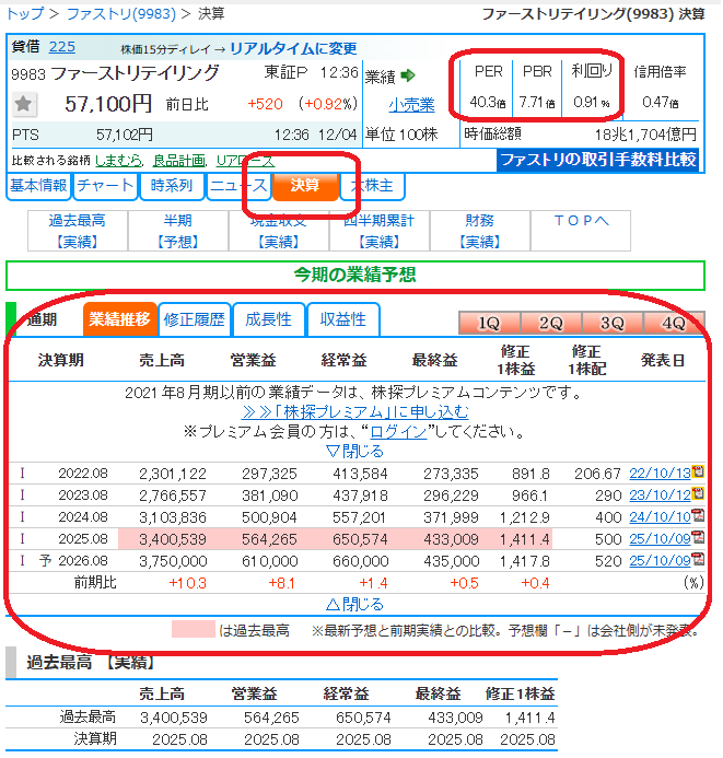 下のスクリーンショットは株探ですが、チャートを見たくなる欲求を一旦抑えて「決算」タブを開いてください。すると過去4年分の売上と利益の推移、そして自社発表の今期業績予測が表になっています。